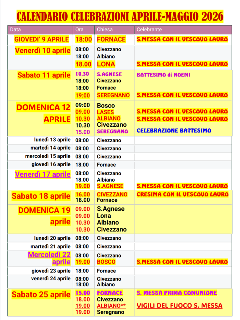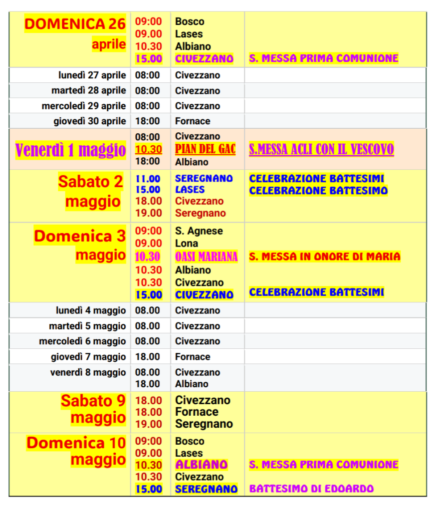 Orari Celebrazioni aprile – maggio 2026 Pubblicato il 11 Aprile 2026 Condividi:Facebook0TwitterWhatsapp